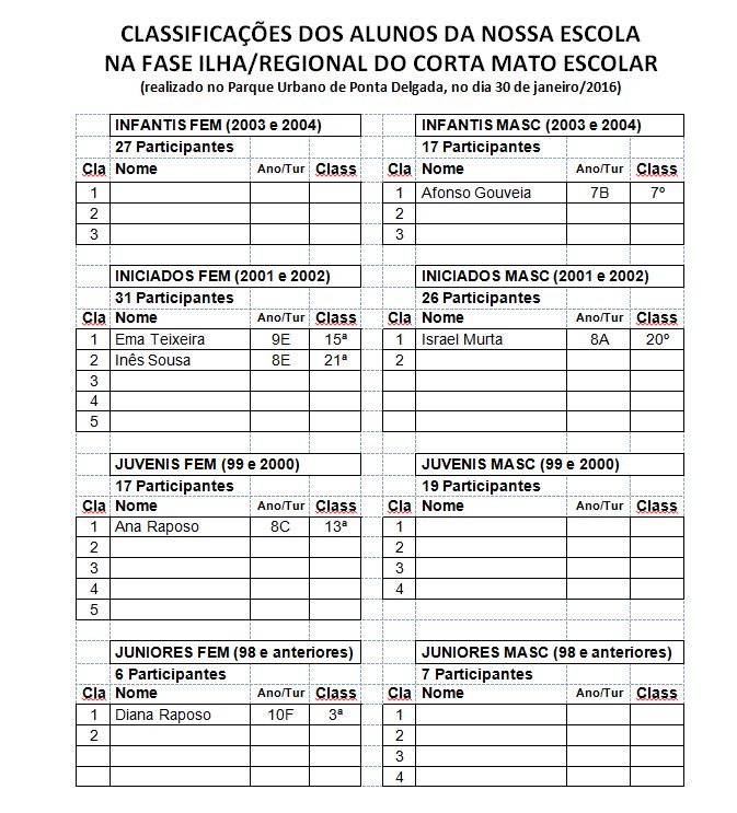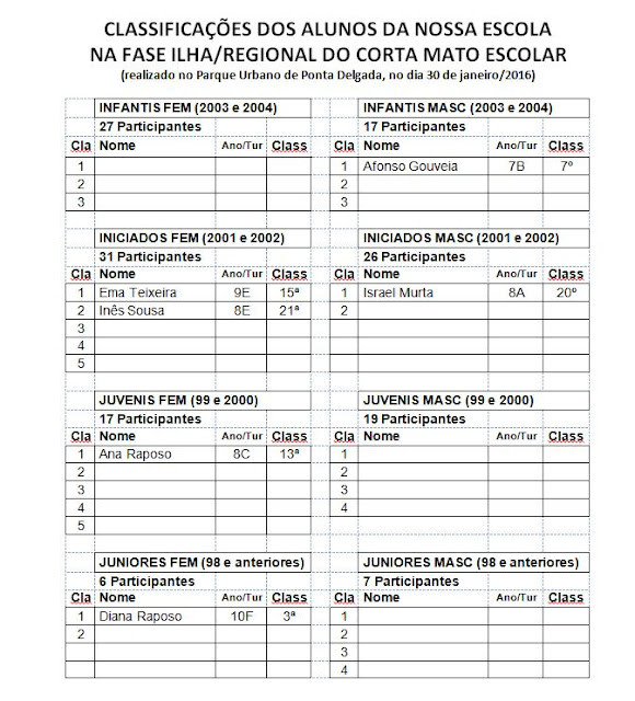 A prova foi realizada em simultâneo com a Fase Regional do Corta Mato Escolar e com o Campeonato de S. Miguel da Associação de Atletismo de S. Miguel. A nossa escola esteve representada por seis atletas. O evento constituiu uma excelente jornada de promoção da corrida e realizou-se no Parque Urbano de Ponta Delgada, contando com a presença do Diretor Regional do Desporto, Diretora Regional da Educação, Presidente da Associação de Atletismo de S. Miguel e do Diretor do Serviço do Desporto de S. Miguel. Os nossos parabéns à organização do evento. A divulgação dos resultados será feita oportunamente.